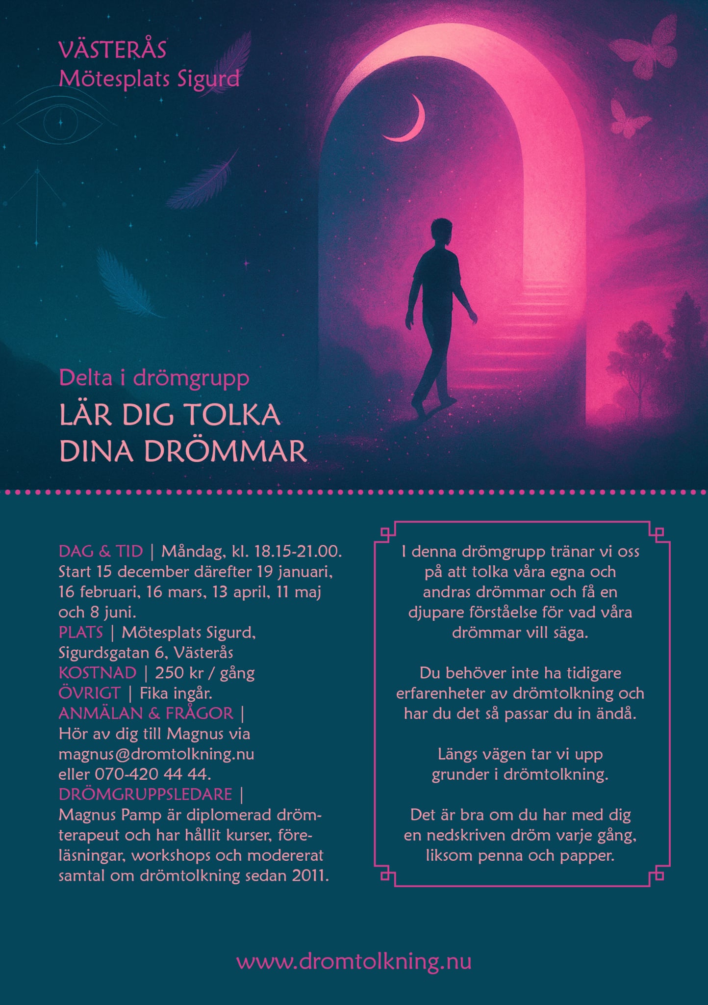 Låt nattens drömmar vägleda och inspirera dig, ta chansen att få veta mer om nattens drömmar och hur du tolkar dem genom drömpedagogen Magnus Pamp som gästar oss denna dag.